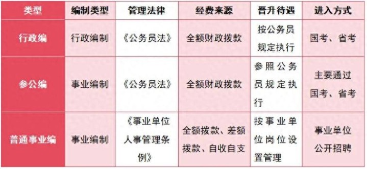参公编,全称是“参照公事员法责罚的行状编制”。咱们从以下几个方濒临比一下行政编、参公编和平淡行状编的隔离: